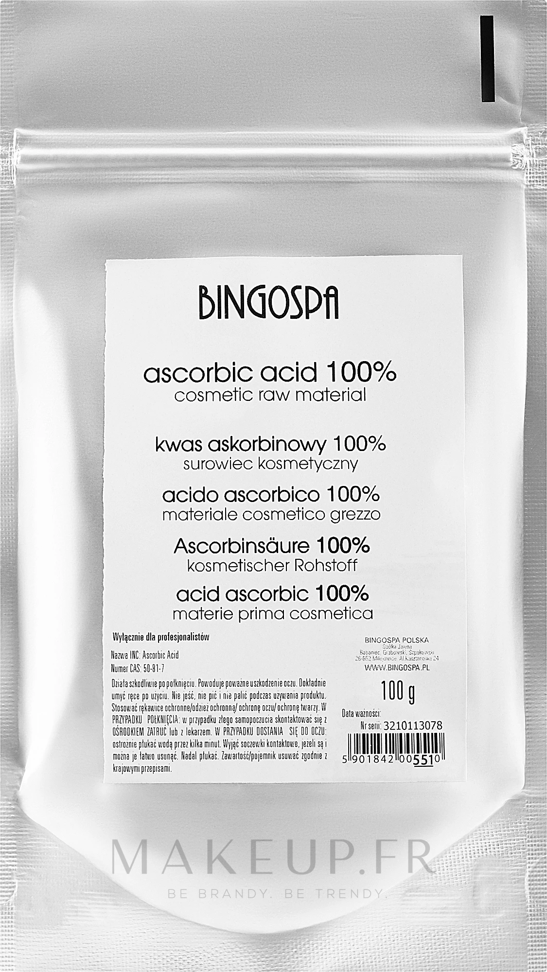 Le produit peut être ajouté aux crèmes, masques ou sérums déjà utilisés. Vous pouvez également créer votre propre préparation nourrissante, lissante et éclaircissante : combinez 4,5 g d’acide ascorbique avec 250 ml d’eau distillée et vaporisez le visage et le corps avec ce mélange. Consultez la notice de sécurité du produit avant de l’utiliser. Rappelez-vous ! L’acide ascorbique ne doit pas être mélangé à de l’eau du robinet ordinaire, car il perdrait ses propriétés antioxydantes. Veillez également à ne pas mélanger le produit avec une cuillère en métal – remplacez-la par un équivalent en plastique.