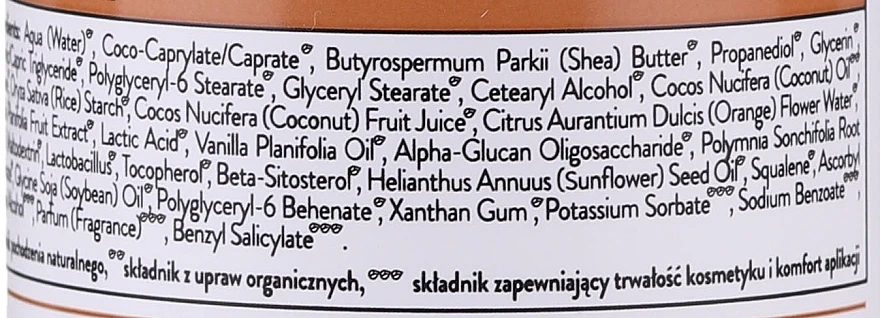 Aqua (Water), Coco-Caprylate/Caprate, Butyrospermum Parkii (Shea) Butter, Propanediol, Glycerin, Caprylic/Capric Triglyceride, Polyglyceryl-6 Stearate, Glyceryl Stearate, Cetearyl Alcohol, Cocos Nucifera (Coconut) Oil, Betaine, Oryza Sativa (Rice) Starch, Cocos Nucifera (Coconut) Fruit Juice, Citrus Aurantium Dulcis (Orange) Flower Water, Vanilla Planifolia Fruit Extract, Lactic Acid, Vanilla Planifolia Oil, Alpha-Glucan Oligosaccharide, Polymnia Sonchifolia Root Juice, Maltodextrin, Lactobacillus, Tocopherol, Beta-Sitosterol, Helianthus Annuus (Sunflower) Seed Oil, Squalene, Ascorbyl Palmitate, Glycine Soja (Soybean) Oil, Polyglyceryl-6 Behenate, Xanthan Gum, Potassium Sorbate, Sodium Benzoate, Benzyl Alcohol, Parfum (Fragrance), Benzyl Salicylate