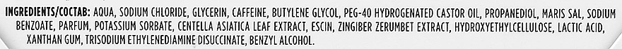 Aqua, Sodium Chloride, Glycerin, Caffeine, Butylene Glycol, Peg-40 Hydrogenated Castor Oil, Propanediol, Maris Sal, Sodium Benzoate, Parfum, Potassium Sorbate, Centella Asiatica Leaf Extract, Escin, Zingiber Zerumbet Extract, Hydroxyethylcellulose, Lactic Acid, Xanthan Gum, Trisodium Ethylenediamine Disuccinate, Benzyl Alcohol
