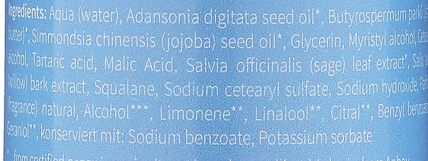Aqua (water), Adansonia digitata seed oil*, Butyrospermum parkii (shea butter)*, Simmondsia chinensis (jojoba) seed oil*, Glycerin, Myristyl alcohol, Cetearyl alcohol, Tartaric acid, Malic acid, Salvia officinalis (sage) leaf extract*, Salix alba (willow) bark extract, Squalane, Sodium cetearyl sulfate, Sodium hydroxide, Parfum (fragrance) natural, Alcohol, Limonene**, Linalool**, Citral**, Benzyl benzoate**, Geraniol**, conservé avec : Sodium benzoate, Potassium sorbate.
