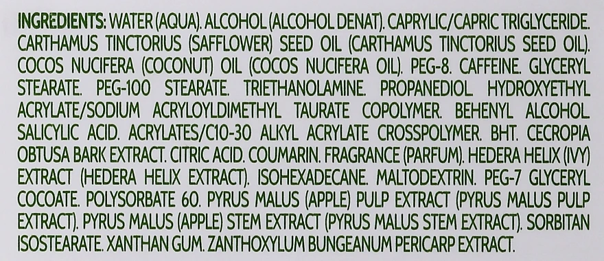 Water (Aqua), Alcohol (Alcohol Denat), Caprylic/Capric Triglyceride, Carthamus Tinctorius (Safflower) Seed Oil (Carthamus Tinctorius Seed Oil), Cocos Nucifera (Coconut) Oil (Cocos Nucifera Oil), Peg-8, Caffeine, Glyceryl Stearate, Peg-100 Stearate, Triethanolamine, Propanediol, Hydroxyethyl Acrylate/Sodium Acryloyldimethyl Taurate Copolymer, Behenyl Alcohol, Salicylic Acid, Acrylates/C10-30 Alkyl Acrylate Crosspolymer, Bht, Cecropia Obtusa Bark Extract, Citric Acid, Coumarin, Fragrance (Parfum), Hedera Helix (Ivy) Extract (Hedera Helix Extract), Isohexadecane, Maltodextrin, Peg-7 Glyceryl Cocoate, Polysorbate 60, Pyrus Malus (Apple) Pulp Extract (Pyrus Malus Pulp Extract), Pyrus Malus (Apple) Stem Extract (Pyrus Malus Stem Extract), Sorbitan Isostearate, Xanthan Gum, Zanthoxylum Bungeanum Pericarp Extract