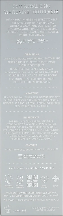 Essayez le dentifrice blanchissant reminéralisant de l’entreprise britannique WhiteWash Laboratories pour découvrir son efficacité pour préserver une santé bucco-dentaire optimale. Les principes actifs au sein de la composition contribuent à fortifier l’émail des dents, à améliorer la reminéralisation et à éviter la formation de caries et de plaque dentaire. En outre, la formule parvient à rendre vos dents plus blanches et à les fortifier considérablement. Le dentifrice se prête à merveille à une utilisation par les personnes ayant de la sensibilité ou présentant un certain risque de dégradation des dents.