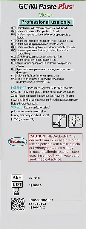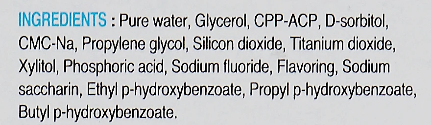 Brossez-vous les dents, pressez la crème sur votre doigt et appliquez-la sur la surface de l’émail. Il est recommandé de garder MI PASTE PLUS dans la bouche pendant au moins 5 minutes. Il est préférable de garder la bouche ouverte pour réduire la salivation. Après utilisation, la crème doit être expulsée et aucun aliment ne doit être consommé pendant 30 minutes. Ne pas utiliser en cas d’allergie aux protéines de lait ou aux hydroxybenzoates. Pour les enfants de 12 ans et moins, consulter un dentiste ou un médecin. Tenir hors de portée des enfants de moins de 6 ans.