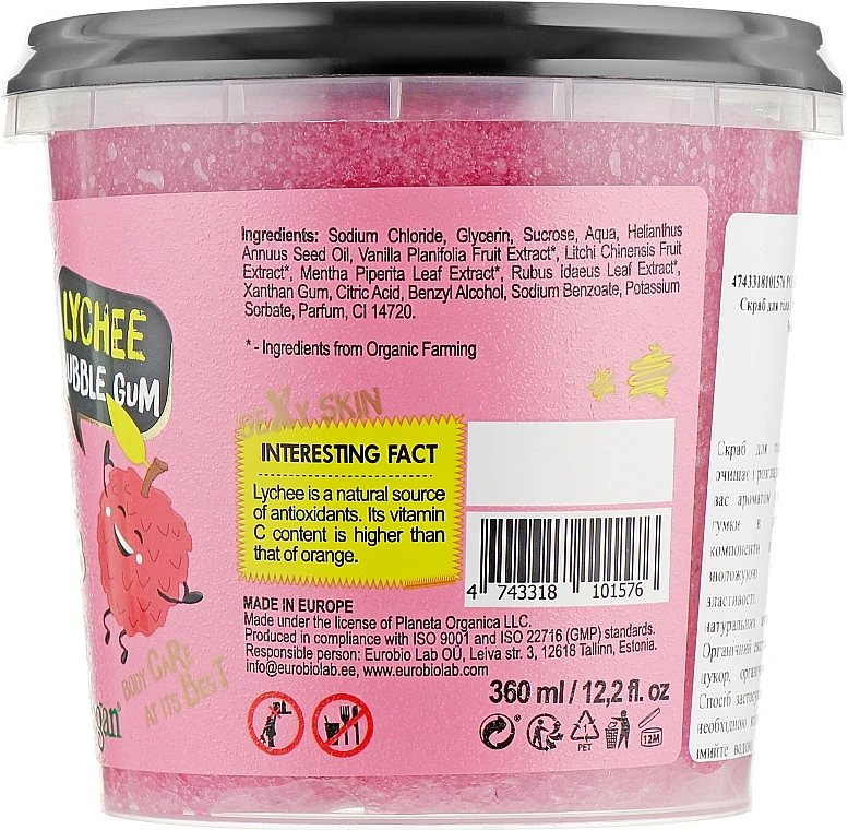 Faites plaisir à votre peau avec le gommage de la marque russe Planeta Organica. La texture onctueuse du produit exfolie les tissus morts en douceur et la laisse veloutée et parfumée à l’odeur sucrée de chewing gum. Infusée d’extraits botaniques, la formule du gommage débarrasse l’épiderme des saletés accumulées et apporte de la souplesse à la peau. L’extrait de litchi est doté de pouvoirs antioxydants grâce à sa teneur élevée en vitamine C. A leur aide, la peau préserve sa jeunesse et résiste aux attaques des radicaux libres.