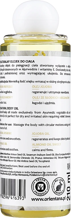 Les spécialistes de la marque polonaise Orientana ont développé cette huile au jasmin indien, parfaite pour l’hydratation et le renforcement de la peau. Sa formule est basée sur une recette traditionnelle ayurvédique et contient des ingrédients naturels qui possèdent des propriétés curatives. Ils sont très efficaces pour ralentir le processus du vieillissement et pour renforcer l’éclat de la peau. Cette huile joue un rôle actif contre les irritations et elle est parfaite pour faire des massages relaxants. Tout cela est grâce à sa riche composition qui est pleine de vitamines et de minéraux.