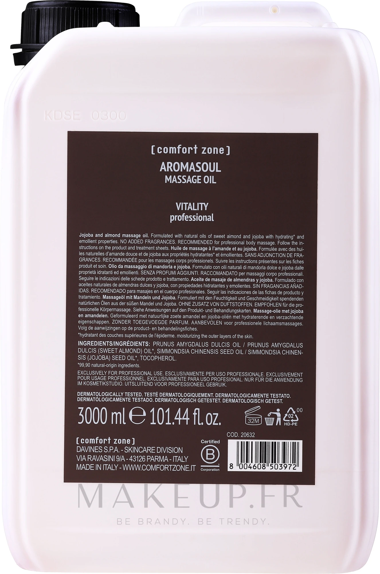 L’huile de massage Aromasoul de l’entreprise italienne Comfort Zone est formulée à base d’huiles végétales et vous offre une multitude de bienfaits. A l’aide de sa composition simple et naturelle, le produit agit avec délicatesse pour vous aider à nourrir la peau, à rétablir son élasticité et à calmer les démangeaisons. Les actions positives des huiles de jojoba, de sésame et d’amande douce sont complétées par les effets antioxydants et anti-inflammatoires de la vitamine E ajoutée à la contenance. L’huile Aromasoul assure un massage hydratant et en même temps relaxant qui vous aide à apaiser l’esprit et à embellir votre peau.