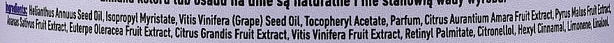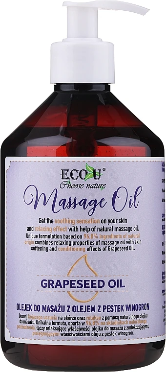 L’huile de massage Eco U Grapeseed Massage Oil fait partie d’une gamme d’huiles de massage relaxantes. Il aide à obtenir une relaxation profonde du corps et de l’esprit tout en se soignant de la beauté de votre peau. La consistance hydrate et assouplit l’épiderme, élimine la sécheresse et les irritations, exerce un effet anti-âge magnifique. Le corps est enveloppé d’un parfum divin qui stimule les sens et favorise la paix de l’esprit. L’huile laisse la peau veloutée, raffermie et lumineuse, le stress et les troubles du sommeil sont neutralisés. L’huile de pépins de raisin est une substance très bénéfique qui exerce un effet éclairant et qui laisse la peau douce et veloutée. Utilisez le produit comme un soin hydratant ou pour compléter vos procédures de spa à la maison.