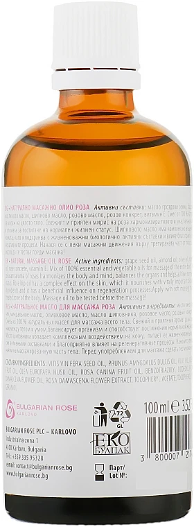 Profitez d’un massage relaxant en prenant soin de votre peau à l’aide de l’huile de massage à la rose bulgare. Ce produit est idéal pour offrir une thérapie complète à l’épiderme. L’huile de rose attribue l’arôme caractéristique à la consistance, tonifie et rafraîchit la peau, favorise la balance émotionnelle et augmente l’énergie de l’organisme. Le soin est enrichi en huiles de pépins de raisin, d’amande douce, d’églantier et d’olive qui nourrissent et hydratent à merveille et exercent un effet anti-âge fantastique. La vitamine E ajoutée freine l’action des radicaux libres et retarde le vieillissement. La surface du corps est lisse, assouplie et dotée d’un éclat sain. Profitez d’une merveilleuse thérapie naturelle tout en vous soignant de la beauté de votre peau et appliquez chaque fois que vous en sentez le besoin.