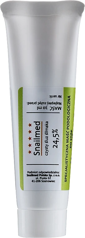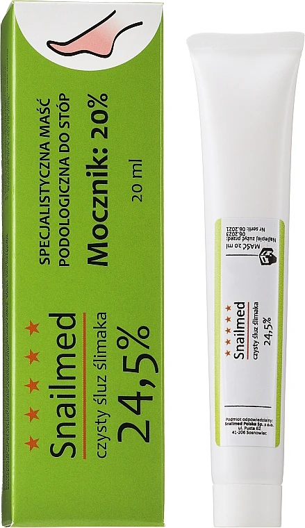 La pommade de l’entreprise polonaise Snailmed vous aide à adoucir et hydrater la peau des pieds. La formule du produit est développée à base de filtrat de bave d’escargot, de beurre de karité, d’urée et d’huile d’avocat. Ensemble, ces ingrédients préviennent le dessèchement cutané, soignent les irritations et éliminent les bactéries. La pommade est adaptée également à un usage par les personnes souffrant de dermatite atopique ou de pied diabétique. La pommade dynamise la régénération cellulaire, supprime les odeurs désagréables et nourrit la peau sèche des pieds.