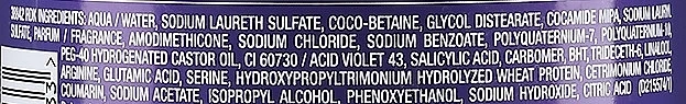 Aqua / Water, Sodium Laureth Sulfate, Coco- Betaine, Glycol Distearate, Cocamide Mipa, Sodium Lauryl Sulfate, Parfum / Fragrance, Amodimethicone, Sodium Chloride, Sodium Benzoate, Polyquaternium-7, Polyquaternium-10, Peg-40 Hydrogenated Castor Oil, Ci 60730 / Acid Violet 43, Salicylic Acid, Carbomer, Bht, Trideceth-6, Linalool, Arginine, Glutamic Acid, Serine, Hydroxypropyltrimonium Hydrolyzed Wheat Protein, Cetrimonium Chloride, Coumarin, Sodium Acetate, Isopropyl Alcohol, Phenoxyethanol, Sodium Hydroxide, Citric Acid.