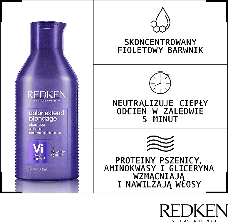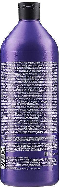 Redken Color Extend Blondage Shampoo est un shampooing déjaunissant destiné aux propriétaires des cheveux blonds, décolorés ou gris. Le complexe de pigments violets contenu dans la formule neutralise les reflets jaunes et cuivrés et préserve la nuance froide comme au premier jour de la coloration. Le produit contient des protéines de blé, des acides aminés et de l’acide citrique qui rehaussent la couleur et maintiennent la brillance. Les cheveux deviennent plus forts et plus lisses à chaque lavage, alors qu’un fin voile protecteur enrobe chaque fibre de sorte à prévenir l’évaporation de l’humidité et la perte d’éléments vitaux. De cette façon, la couleur souhaitée est prolongée et vos cheveux gardent leur aspect soyeux et naturel.