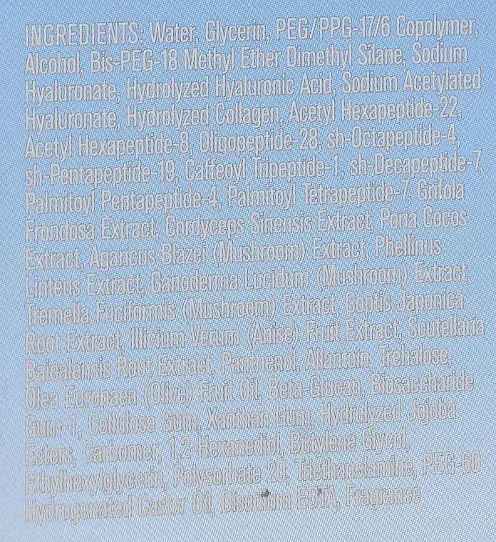 Water, Glycerin, PEG/PPG-17/6 Copolymer, Alcohol, Bis-PEG-18 Methyl Ether Dimethyl Silane, Sodium Hyaluronate, Hydrolyzed Hyaluronic Acid, Sodium Acetylated Hyaluronate, Hydrolyzed Collagen, Acetyl hexapeptide-22, Acetyl Hexapeptide-8, Oligopeptide-28, sh-Octapeptide-4, sh-Pentapeptide-19, Caffeoyl Tripeptide-1, sh-Decapeptide-7, Palmitoyl Pentapeptide-4, Palmitoyl Tetrapeptide-7, Grifola Frondosa Extract, Cordyceps Sinensis Extract, Poria Cocos Extract, Agaricus Blazei (Mushroom) Extract, Phellinus Linteus Extract, Ganoderma Lucidum (Mushroom) Extract, Tremella Fuciformis (Mushroom) Extract, Coptis Japonica Root Extract, Illicium Verum (Anise) Fruit Extract, Scutellaria Baicalensis Root Extract, Panthenol, Allantoin, Trehalose, Olea Europaea (Olive) Fruit Oil, Beta-Glucan, Biosaccharide Gum-1, Cellulose Gum, Xanthan Gum, Hydrolyzed Jojoba Esters, Carbomer, 1,2-Hexanediol, Butylene Glycol, Ethylhexylglycerin, Polysorbate 20, Triethanolamine, PEG-60 Hydrogenated Castor Oil, Disodium EDTA, Fragrance.