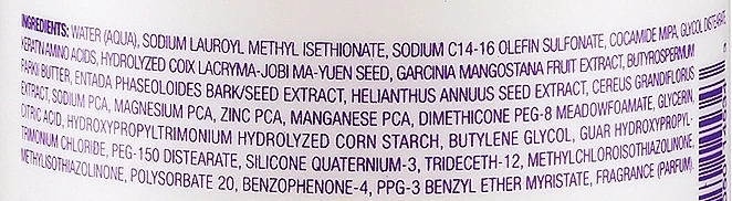 Water (Aqua), Sodium Lauroyl Methyl Isethionate, Sodium C14-16 Olefin Sulfonate, Cocamide Mipa, Glycol Distearate, Keratin Amino Acids, Hydrolyzed Coix Lacrymajobi Mayuen Seed, Garcinia Mangostana Fruit Extract, Butyrospermum Parkii Butter, Entada Phaseoloides Bark/Seed Extract, Helianthus Annuus Seed Extract, Cereus Grandiflorus Extract, Sodium Pca, Magnesium Pca, Zinc Pca, Manganese Pca, Dimethicone PEG-8 Meadowfoamate, Glycerin, Citric Acid, Hydroxypropyltrimonium Hydrolyzed Corn Starch, Butylene Glycol, Guar Hydroxypropyltrimonium Chloride, PEG-150 Distearate, Silicone Quaternium-3, Trideceth-12, Methylchloroisothiazolinone, Methylisothiazolinone, Polysorbate 20, Benzophenone-4, PPG-3 Benzyl Ether Myristate, Fragrance (Parfum).
