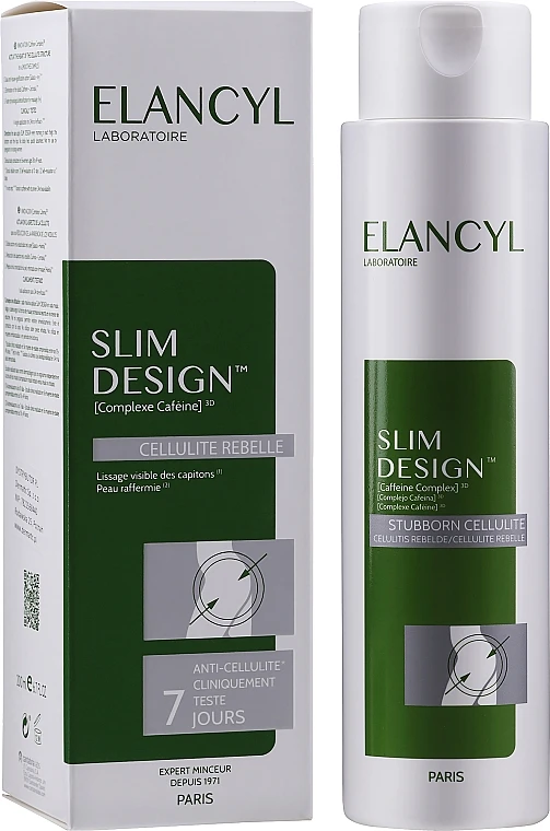 Elancyl Slim Design est un produit innovant basé sur le complexe Caffeine 3D, développé pour lutter contre la cellulite tenace et ses mécanismes de formation. Ce produit minceur agit sur les zones affectées par la peau d’orange dans trois directions: il réduit les dépôts de graisse, renforce le tissu conjonctif et stimule la circulation lymphatique. Infusé d’extrait de lierre qui favorise l’élimination des toxines et possède des propriétés drainantes, ainsi et caféine qui tonifie la peau et améliore la microcirculation, le concentré de soin permet de retrouver une peau plus ferme, plus lisse et plus souple après seulement 7 jours d’utilisation quotidienne. Grâce à sa composition enrichie en cellules souches de pomme, il contribue à la régénération et au raffermissement de la peau. La formule contient également des pigments réflecteurs de lumière qui améliore l’apparence de la cellulite. Aussi, sa texture légère pénètre rapidement dans la peau sans laisser de résidus gras.