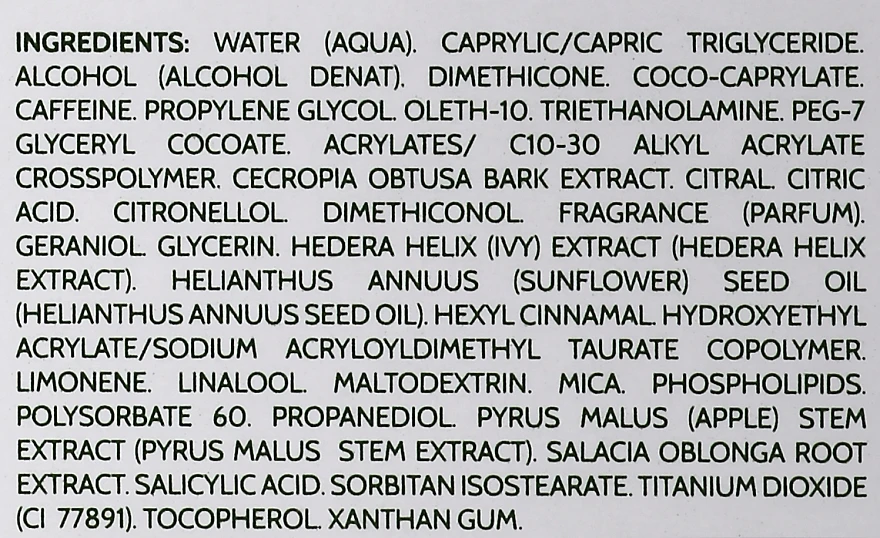 Water (Aqua). Alcohol (Alcohol Denat). Carthamus Tinctorius (Safflower) Seed Oil (Carthamus Tinctorius Seed Oil). Coco-Caprylate. Glycerin. Caprylic/Capric. Triglyceride. Glyceryl Stearate. Isopropyl Palmitate. PEG-100 Stearate. Oenothera Biennis (Evening Primrose) Oil (Oenothera Biennis Oil). Dimethicone. Propanediol. Polyacrylate-13. Caffeine. Artemia Extract. Benzoic Acid. Caprylyl Glycol. Cecropia Obtusa Bark Extract. Citral. Citric Acid. Citronellol. Dimethiconol. Fragrance (Parfum). Geraniol Hedera Helix (Ivy) Extract (Hedera Helix Extract). Helianthus Annuus (Sunflower) Seed Oil Helianthus Annuus Seed Oil). Hexyl Cinnamal. Limonene. Linalool. Maltodextrin. Polyisobutene. Polysorbate 20. Pyrus Malus (Apple) Stem Extract (Pyrus Malus Stem Extract). Salacia Oblonga Root Extract. Sodium Benzoate. Sodium Hydroxide. Sodium Polyacrylate. Sorbitan Isostearate. Tocopherol. Zanthoxylum Bungeanum Pericarp Extract.